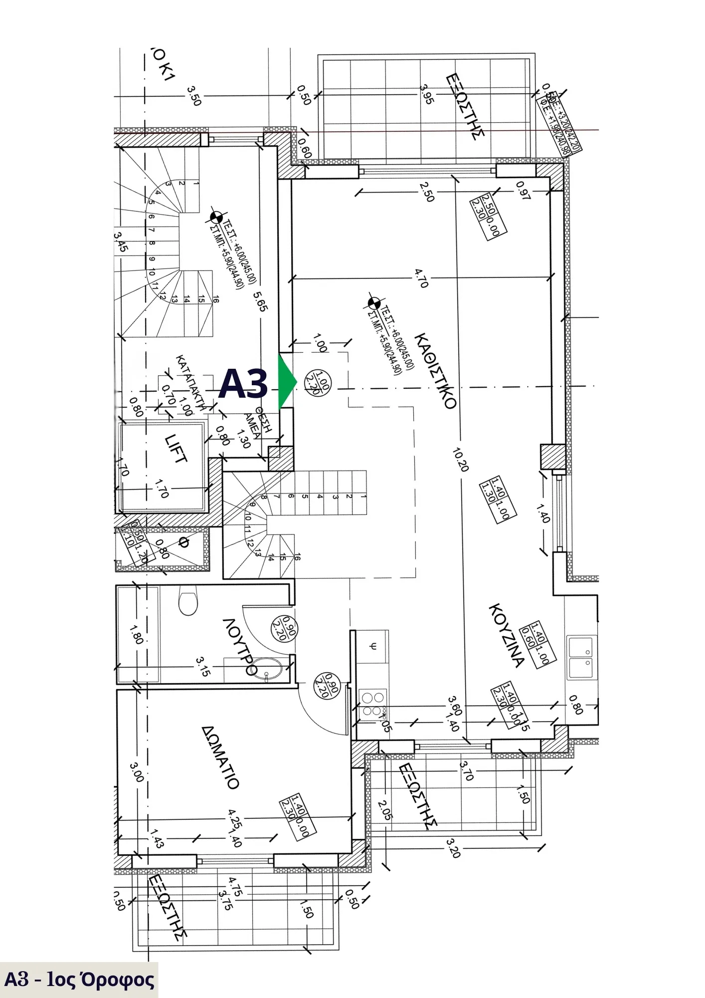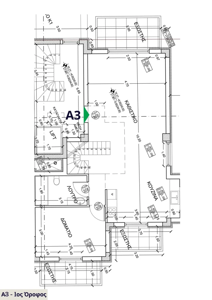 Η μεζονέτα Α3 ξεχωρίζει για την εργονομία και τη διακριτική πολυτέλεια των χώρων της. Το πρώτο επίπεδο περιλαμβάνει άνετο σαλόνι, τραπεζαρία, κουζίνα, ένα υπνοδωμάτιο και μπάνιο. Η σοφίτα φιλοξενεί δύο επιπλέον υπνοδωμάτια και δεύτερο μπάνιο, μαζί με έναν επιπλέον χώρο καθιστικού – ιδανικό για χρήση ως γραφείο, playroom ή lounge. Οι εσωτερικοί χώροι συνδυάζουν φυσικό φως, ευελιξία και ιδιαίτερη αισθητική με χρήση υλικών υψηλής ποιότητας.