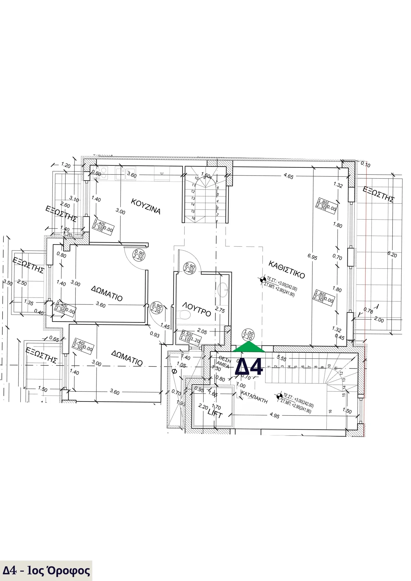 Η μεζονέτα Δ4 προσφέρει μοναδική κατοικία τριών επιπέδων με τέσσερα υπνοδωμάτια, ιδανική για οικογένειες ή για όσους αναζητούν άνεση και ξεχωριστή αισθητική. Το κυρίως επίπεδο φιλοξενεί τους βασικούς χώρους καθημερινής ζωής, με μεγάλες επιφάνειες καθιστικού και κουζίνας, ενώ οι πάνω όροφοι προσφέρουν απόλυτη ιδιωτικότητα και εργονομία. Το ιδιωτικό δώμα στην κορυφή λειτουργεί ως φυσική προέκταση του σπιτιού για στιγμές χαλάρωσης, ψυχαγωγίας ή φιλοξενίας με πανοραμική θέα.