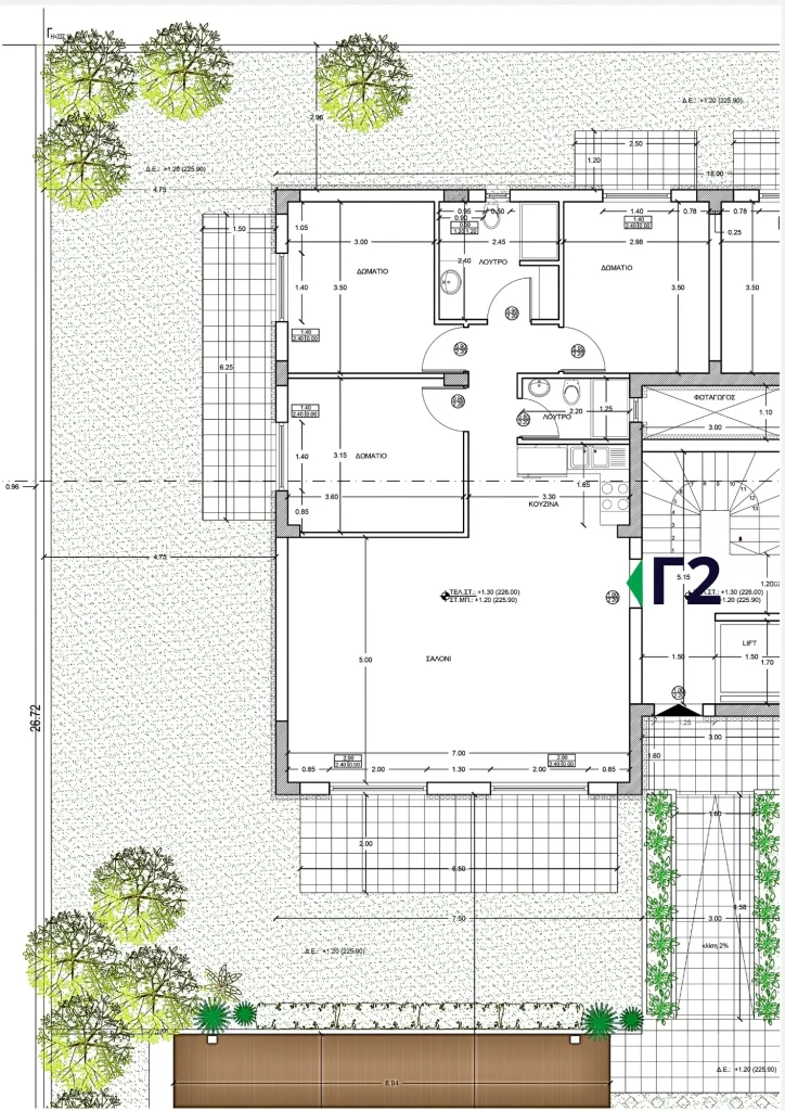 Στο Elýti Residences, το Garden Living – Διαμέρισμα Γ2 (Ισόγειο, 114.5 τ.μ.) συνδυάζει αρχιτεκτονική απλότητα με ιδιωτικότητα υψηλών προδιαγραφών. Ο ενιαίος καθιστικός–κουζίνα ανοίγεται σε ευρύχωρες βεράντες, ενώ η διαμπερής κάτοψη εξασφαλίζει άπλετο φυσικό φως και ομαλή ροή στον χώρο. Τρία υπνοδωμάτια και δύο μπάνια οργανώνουν καθαρά τις ζώνες ημέρας/νύχτας, με ιδιόχρηση εμπρόσθιου και πίσω κήπου να επεκτείνει την καθημερινή διαβίωση προς τα έξω. Η υπόγεια θέση στάθμευσης και η απευθείας σύνδεση με τον ανελκυστήρα ολοκληρώνουν μια ολοκληρωμένη πρόταση κατοίκησης με χαμηλή συντήρηση, υψηλή εμπορική απήχηση και σταθερή επενδυτική αξία.