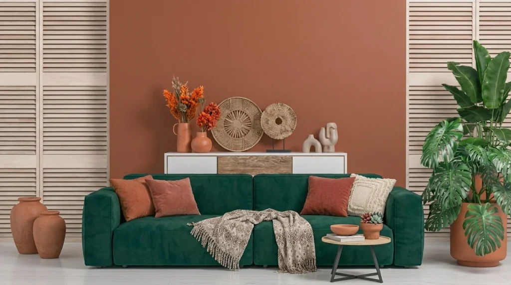 • Πού να το χρησιμοποιήσετε: Ταιριάζει εκπληκτικά σε σαλόνια και τραπεζαρίες. Ένας τοίχος (accent wall) βαμμένος σε βαθιά τερακότα μπορεί να μεταμορφώσει έναν αδιάφορο χώρο στο απόλυτο κέντρο χαλάρωσης. Συνδυάζεται άψογα με έπιπλα από ακατέργαστο ξύλο, ψάθα και μεγάλα φυτά εσωτερικού χώρου.